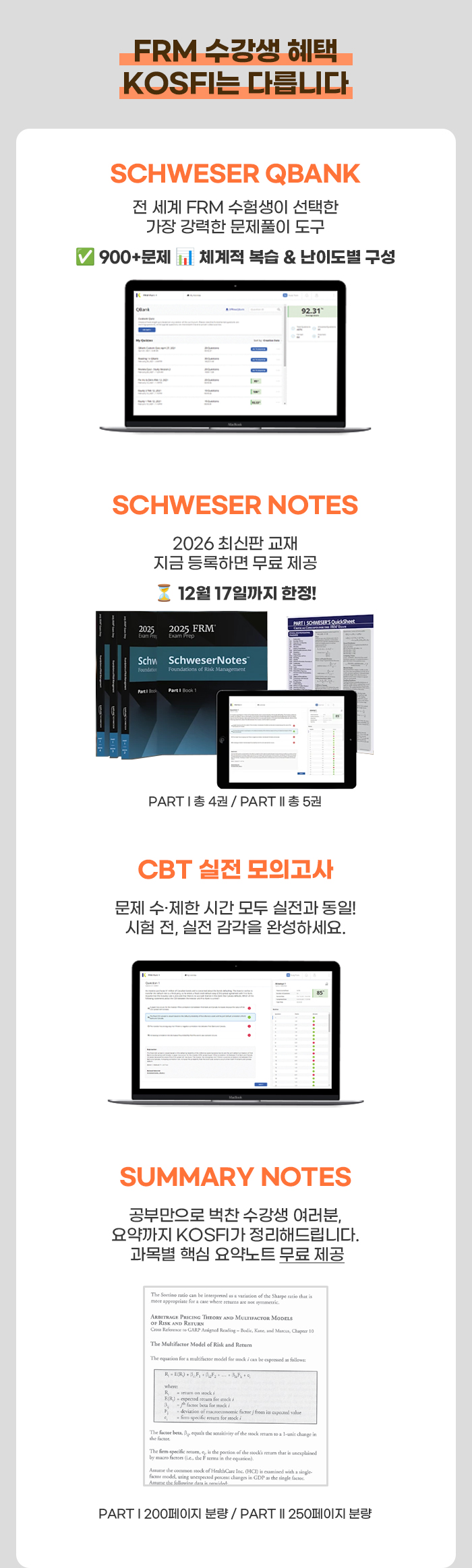 1. 제공 항목 - 2025년 교재 - 2026 Schweser Notes: 2026년 2월 중 - Summary Note: 2026년 3월 중 - 데일리 문제: 2026년 3월 중 - 2026 Schweser QBANK 온라인 문제풀이: 2026년 3월 중 - 전 과목 온라인 강의 - 실전 모의고사: 2026년 4월 중