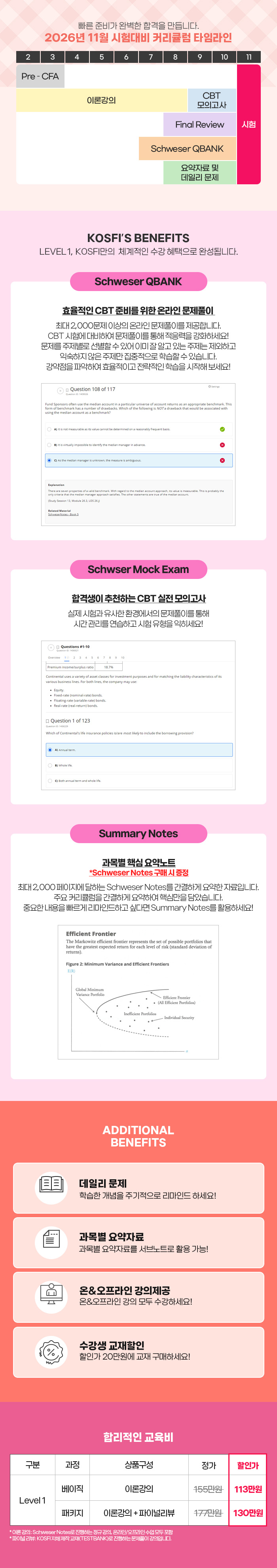 1. 제공 항목 · 온라인, 모바일 강의 전 과목 · 2026 Schweser Q-Bank : 6월 중 예정 · 2026 Schweser Online Mock Exam : 10월 중 예정 · 데일리 문제 : 주 3회 메일 발송, 26년 8월부터 순차적으로 발송 예정 · Summary Notes 제공 (Schweser Notes 구매 시 제공)