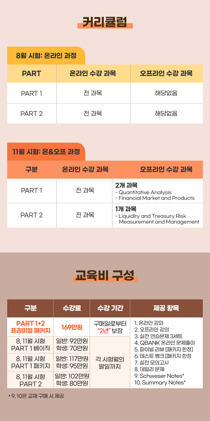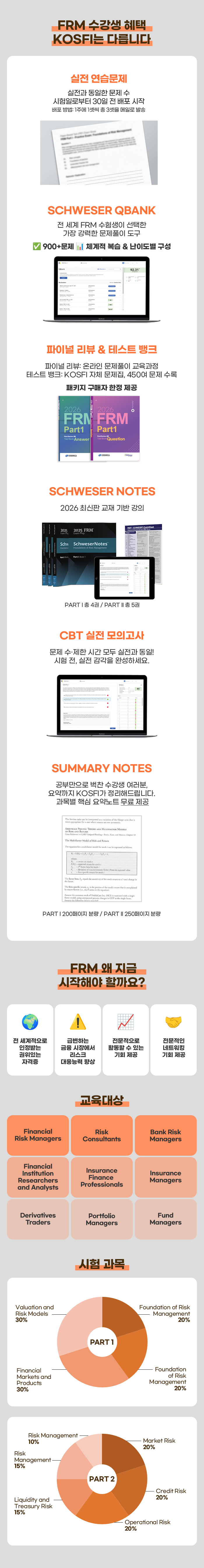 | 요약설명 | 1. 제공 항목 - 2026 Schweser Notes: 교재 구매 시 - Summary Note (교재 구매 시) - 실전 연습문제 3세트: 10월 중 배포 시작, 1주에 1세트 배포 - Final Review: 3월 중 업데이트 - 데일리 문제: 9월 중 - 2026 Schweser QBANK 온라인 문제풀이: 6월 중 - 전 과목 온라인 강의 - 실전 모의고사: 10월 중 2. 할인 혜택 - KOSFI 재수강생: KOSFI에서 FRM 1을 수강하신 수강생 - 이패스 재수강생 : 이패스에서 FRM 1을 수강하신 수강생 - 재도전 응시생 : FRM 1 응시 이력이 있는 수강생 * 모든 온라인 컨텐츠의 만료일은 2026년 11월 30일 |