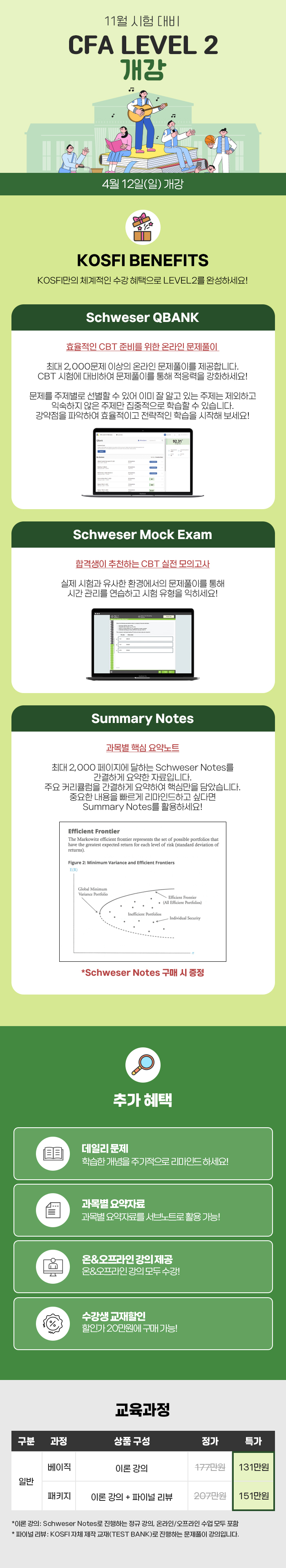 1. 제공 항목 · 전 과목 온라인, 모바일 강의 · 2026 Schweser Q-Bank : 6월 중 예정 (교육 과정의 수강 기간을 연기하거나 연장 시, QBANK는 연기&연장되지 않음) · 2026 Schweser Online Mock Exam : 10월 중하순 예정 · 파이널 리뷰 : 8월 예정 · 과목별 요약자료 · 데일리 문제 : 주 3회 메일 발송 : 8월 중 예정 · Summary Notes 제공 (Schweser Notes 구매 시 제공)